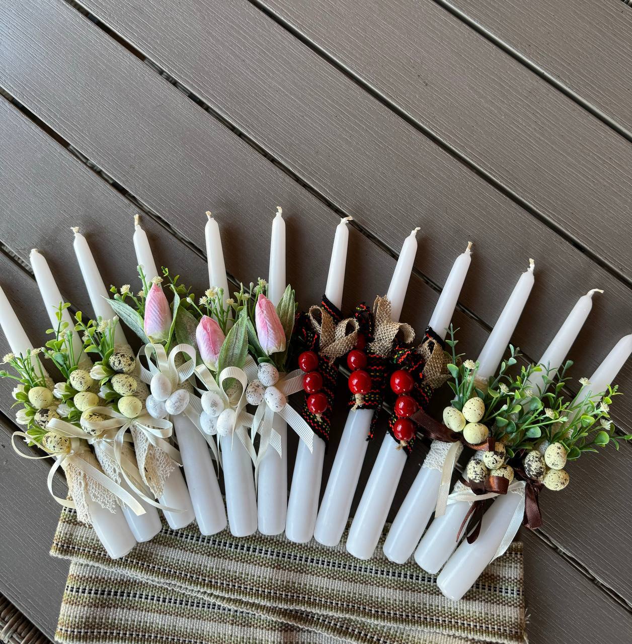Кожна свічка прикрашена вручну: стрічками, текстильними елементами, мініатюрними квітами та декоративними яєчками, що створюють атмосферу тепла й затишку. Поєднання натуральних відтінків — білого, зеленого, бежевого — виглядає дуже естетично та гармонійно.