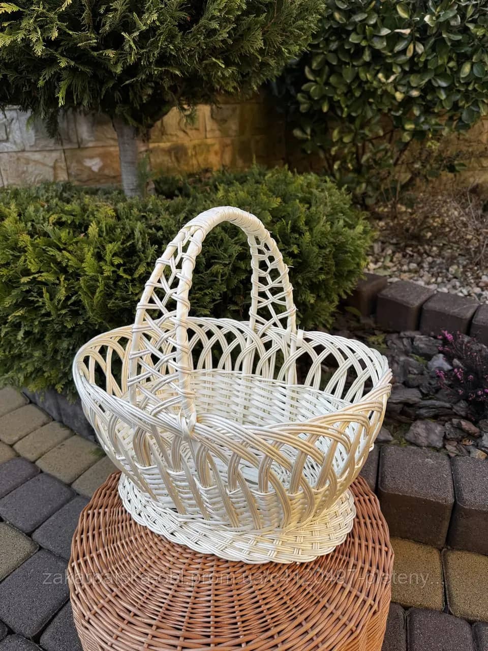 Виготовлено із природної білої лози. Якісне плетіння, цільна лоза. Середній розмір корзинки.