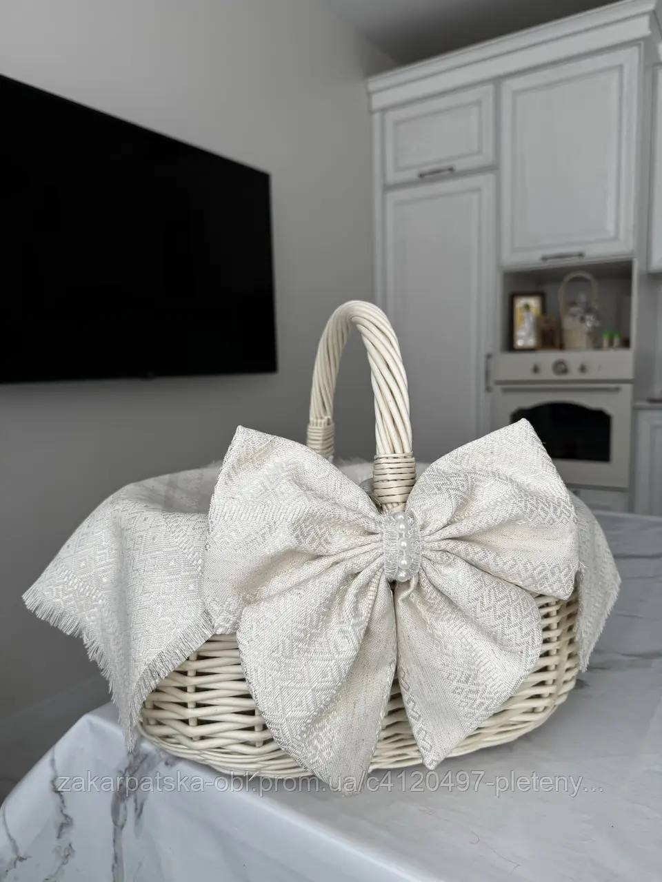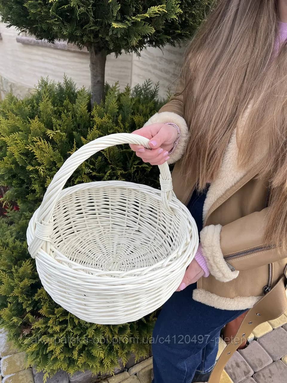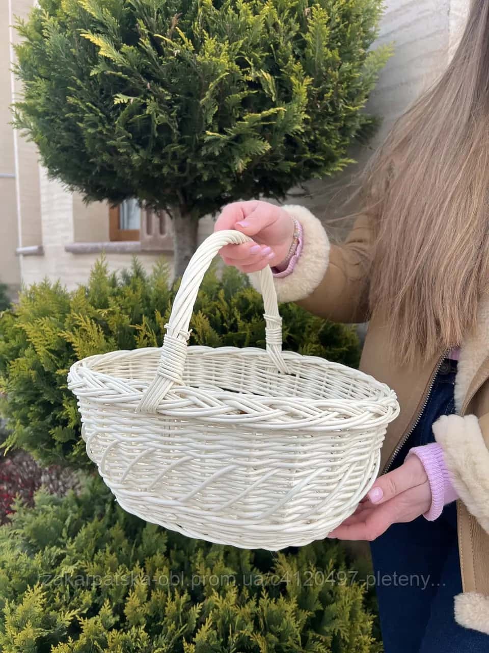Виготовлено із природної білої лози. Якісне плетіння, цільна лоза. Середній розмір корзинки.